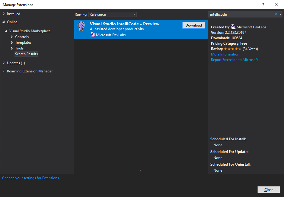 본문에서 IntelliCode에 대해서 이야기 했던 내용 중에 현재는 Extensions에서 다운로드를 받아서 사용해야 한다는 내용이 누락되어 있어서 추가합니다.