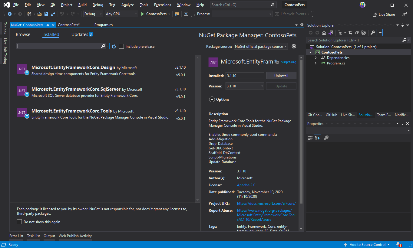 Microsoft.EntityFrameworkCore.SqlServer, Microsoft.EntityFrameworkCore.Design, Microsoft.EntityFrameworkCore.Tools 패키지를 설치합니다.