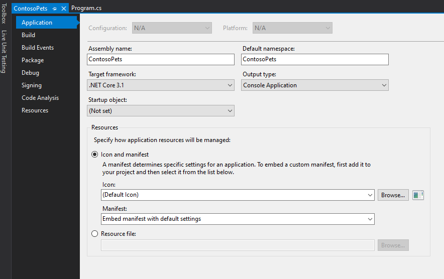 생성된 프로젝트의 속성 페이지를 확인하면 정확한 버전을 알 수 있습니다. 여기서는 .NET Core 3.1로 작업을 하도록 하겠습니다. 최신버전은 .NET 5.0입니다.