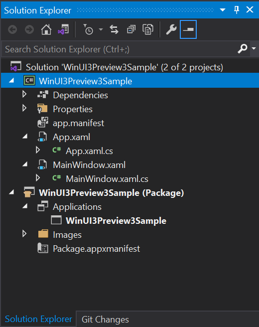 하나의 프로젝트가 아니라 두 개의 프로젝트가 표시됩니다. 이는 preview3에서 WinUI3를 실행하려면 앱 ID가 필요하고 WinUI Desktop이 Win32 애플리케이션 (기본적으로 앱 ID가 없음)이므로 어떻게 든 제공해야하기 때문입니다. 이 문제에 대한 올바른 해결책은 패키징 프로젝트 (MSIX)를 통해 Win32 프로젝트를 패키징하는 것입니다. 이것이 "WinUI3Preview3Sample (패키지)"프로젝트입니다. 단순히 주 Win32 프로젝트를 참조하고 AppXManifest 파일을 추가합니다.