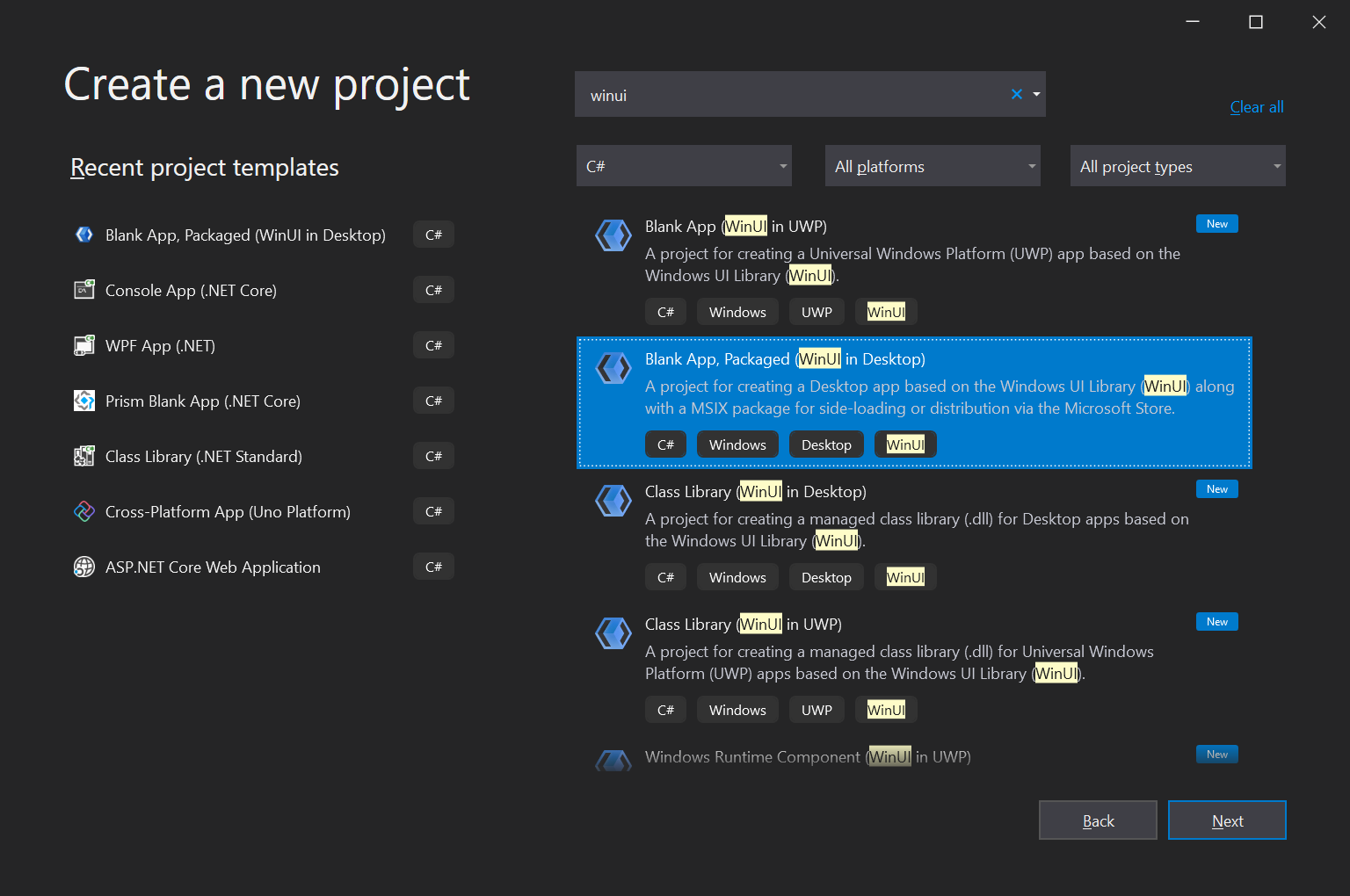템플릿이 설치된 VS Preview에서 새 WinUI Desktop 프로젝트를 만들기 만하면됩니다.