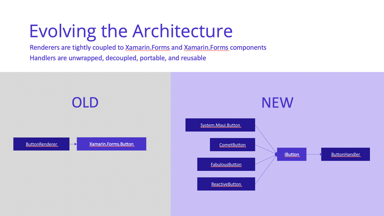 .NET MAUI의 새로운 처리기 아키텍처는 뷰 래핑을 제거하여 뷰를 렌더링하는 데 필요한 UI 컨트롤 수를 줄입니다. 또한 기본적으로 프레임워크 자체에서 플랫폼 제어를 분리합니다. Xamarin.Forms에서 각 렌더러에는 플랫폼 간 요소에 대한 참조가 있으며 종종 INotifyPropertyChanged를 사용하여 작동합니다. 이러한 렌더러를 사용하는 대신 .NET MAUI는 핸들러라는 새로운 패턴을 도입합니다.
