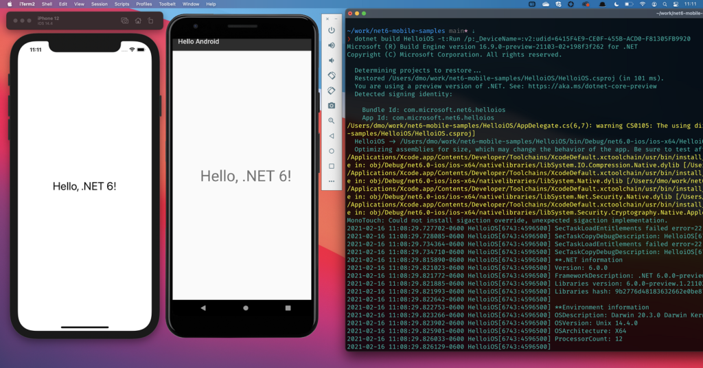 이 이미지는 macOS 터미널에서 dotnet으로 시작되는 Android 및 iOS 앱을 보여줍니다. 물리적 모바일 하드웨어에서도 동일하게 실행될 수 있습니다. 앱에는 dotnet-runtimeinfo에서 조정 된 코드가 포함되어 있으며 디버그 출력 창에 Debug.WriteLine 추적과 함께 결과가 표시됩니다. 이 앱은 .NET SDK로 실행되는 .NET 라이브러리를 사용하여 Mono 런타임에서 실행됩니다.