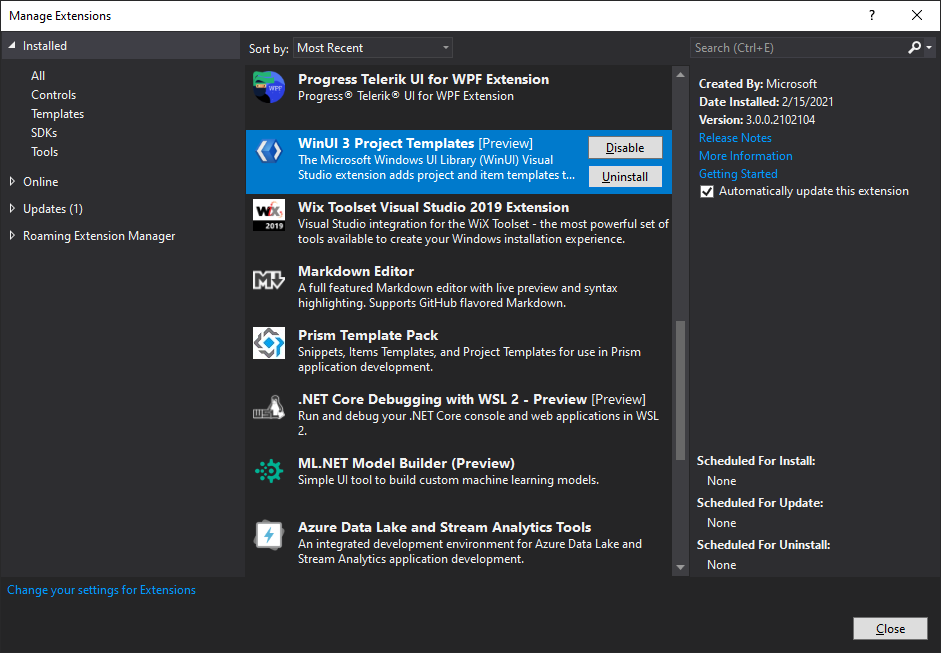 Visual Studio 2019 Extension에 WinUI 3 Project Templates [Preview]가 설치되어 있다면 제거 필수