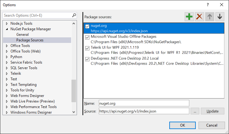 Tools -> Options -> NuGet Package Manager -> Package Sources -> nuget.org 존재하는지 확인