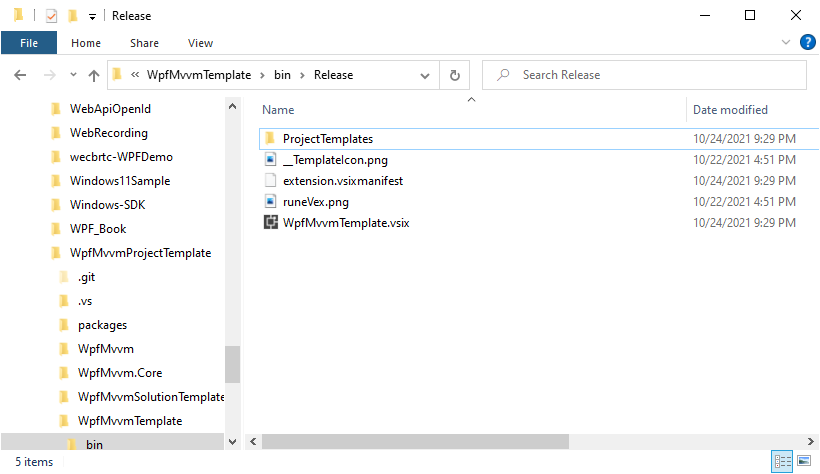 5. WpfMvvmTemplate 폴더로 이동 후 bin -> Release -> WpfMvvmTemplate.vsix 파일이 생성된 것을 확인합니다.