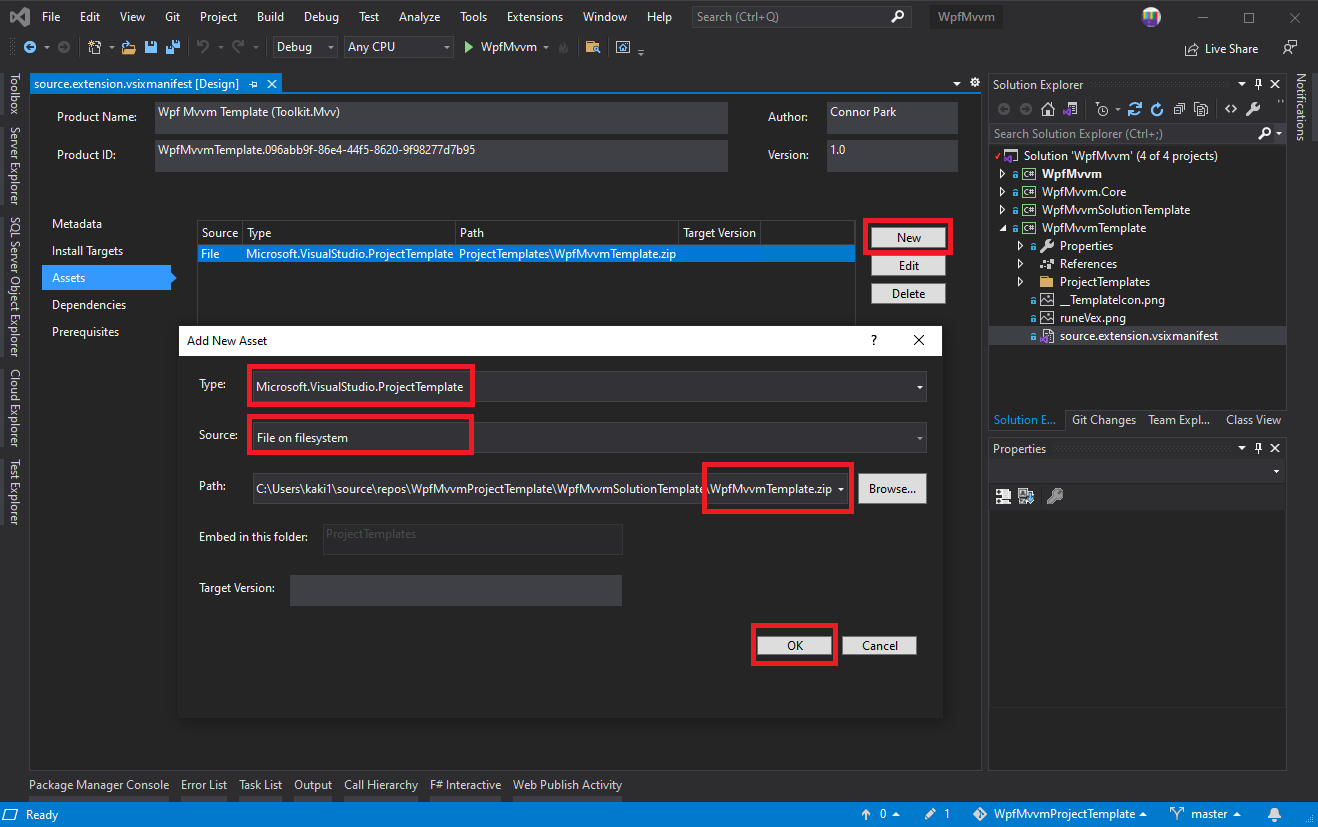 Assets 탭 -> New -> Type: ProjectTemplate -> Source : File on filesystem -> Path : WpfMvvmTemplate.zip 파일 선택 후 OK 클릭