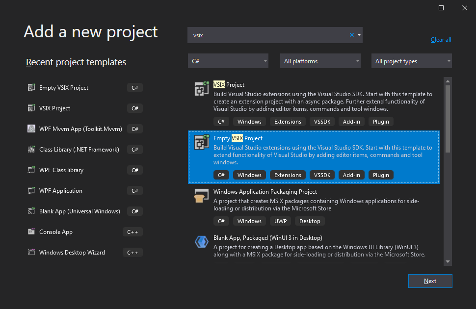 솔루션에서 프로젝트를 추가해서 vsix로 검색하면 Empty VSIX Project가 검색됩니다.