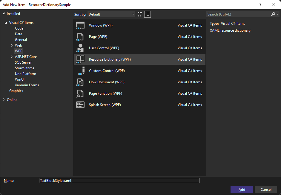 아래와 같이 Add New Item에서 WPF를 선택하시고, Resource Dictionary (WPF)를 선택하신 후 이름을 입력하고 Add를 누릅니다. TextBlock의 Style을 리소스로 만들 예정이라 TextBlockStyle.xaml이라고 입력했습니다.
