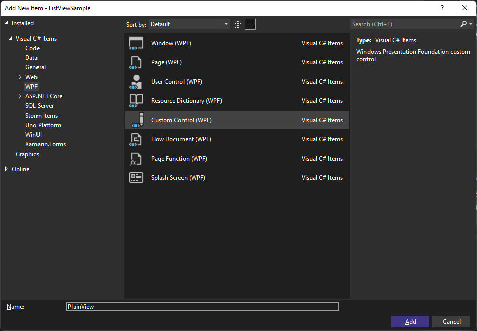 프로젝트 팝업 메뉴 -> Add -> New Item -> WPF -> Custom Control(WPF)를 선택 후 Name에 PlainView를 입력하고 Add를 클릭합니다.