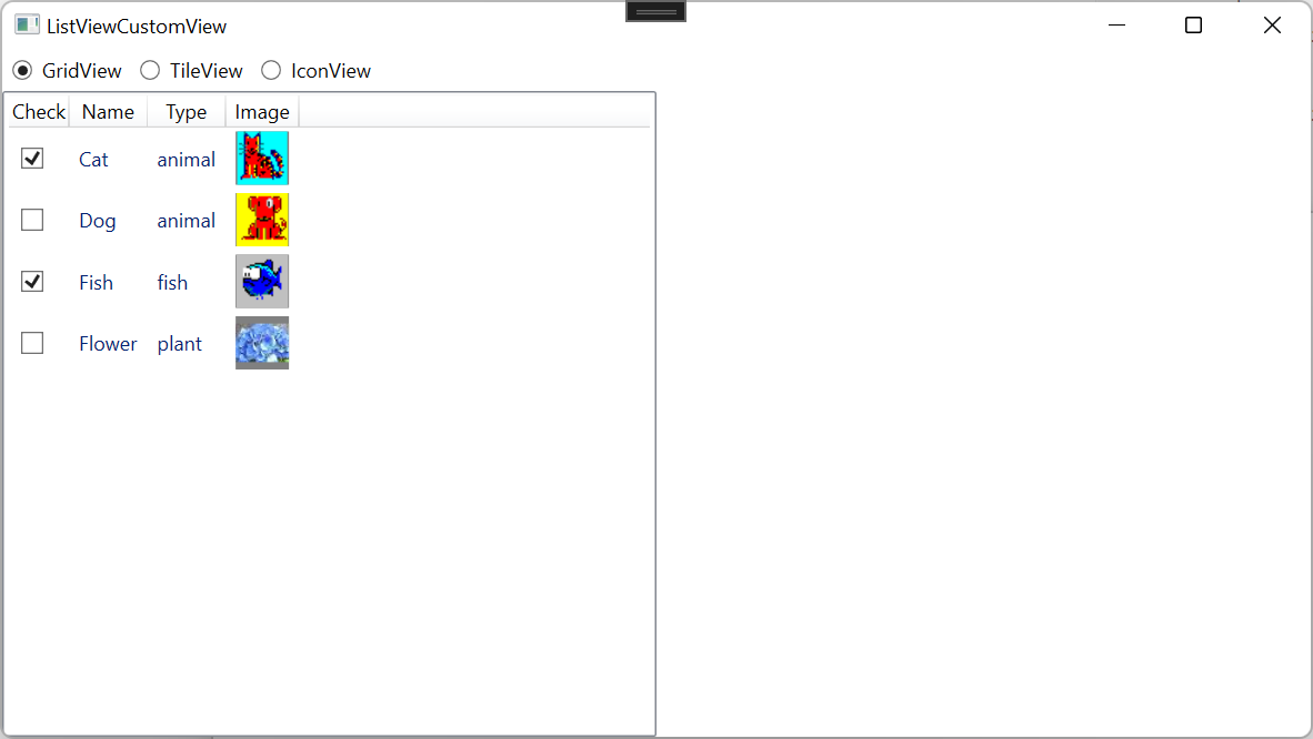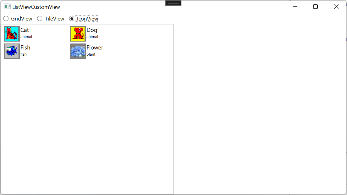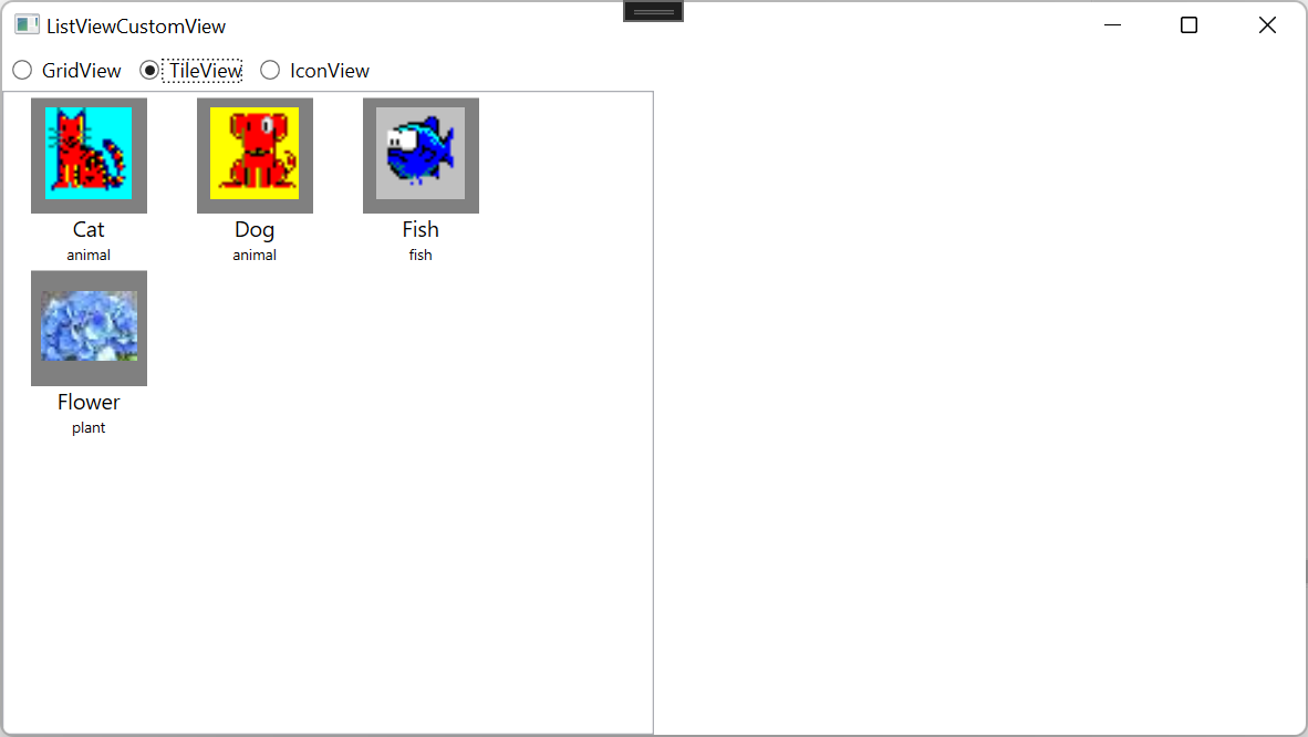 RadioButton을 선택할 때 발생하는 IsChecked 이벤트가 발생하면 Default_Checked 이벤트 핸들러가 실행되면서 ListView.View에 gridView, tileView, iconView를 선택적으로 입력해서 형태를 변경합니다.
