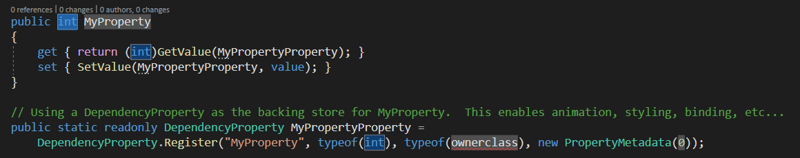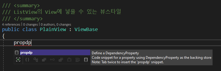 propdp를 입력하고 tab키를 두번 눌러 DependencyProperty를 추가합니다.