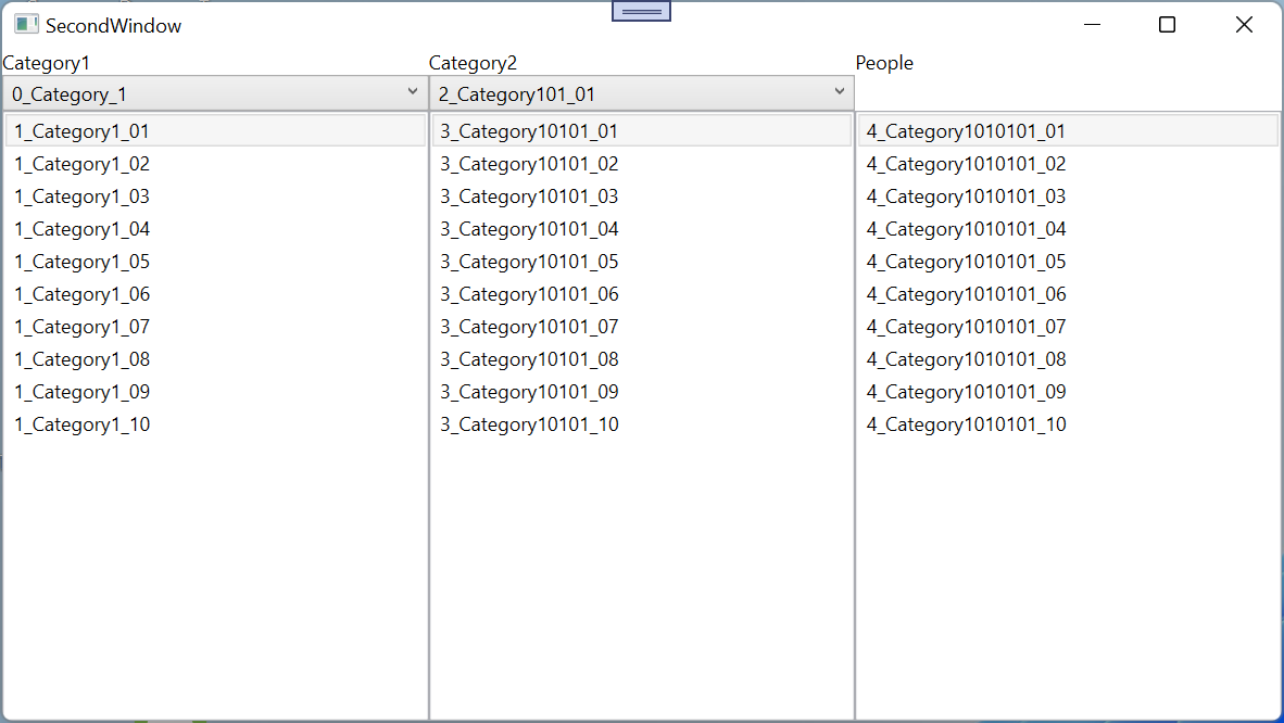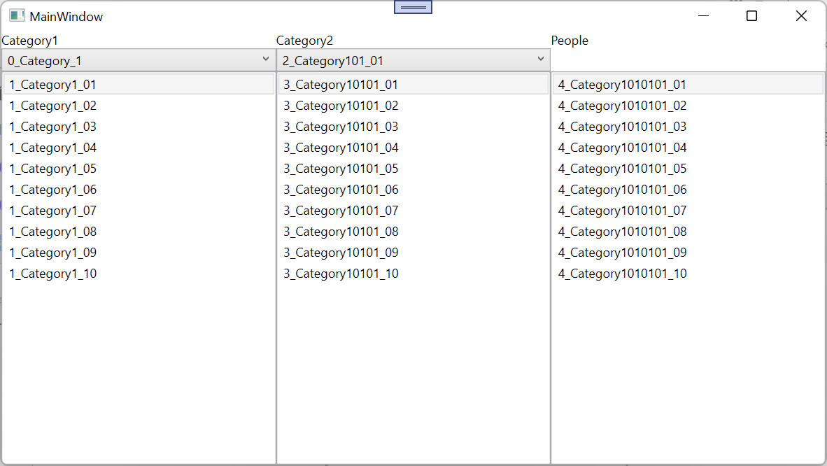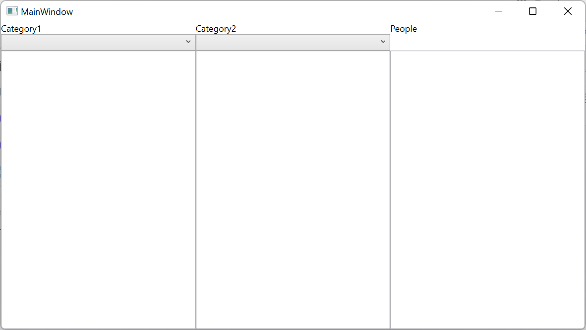 CategoryComboBox1, CategoryListBox1, CategoryComboBox2, CategoryListBox2 이렇게 4개의 컨트롤을 배치하고, 각 컨트롤의 SelectionChanged 이벤트를 연결했습니다.