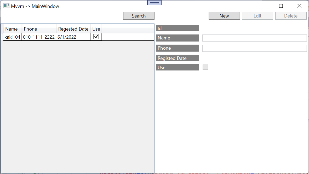 실행 후 선택된 Member가 없을 때는 Edit, Delete Button이 비활성화 되어 있습니다.