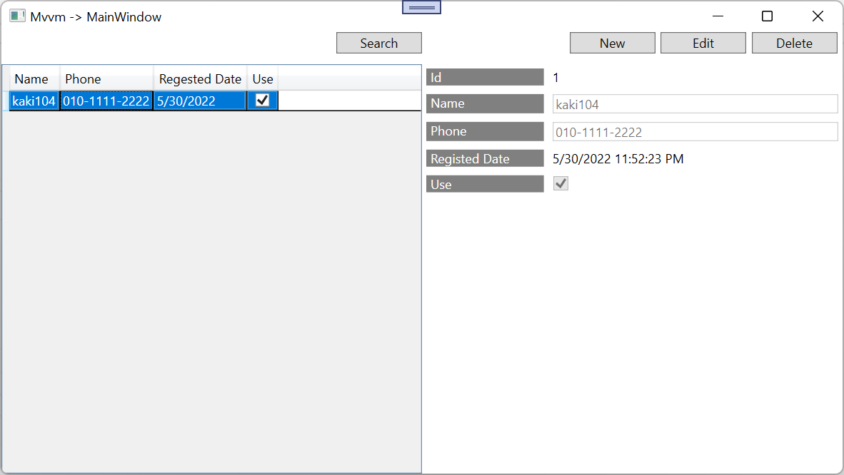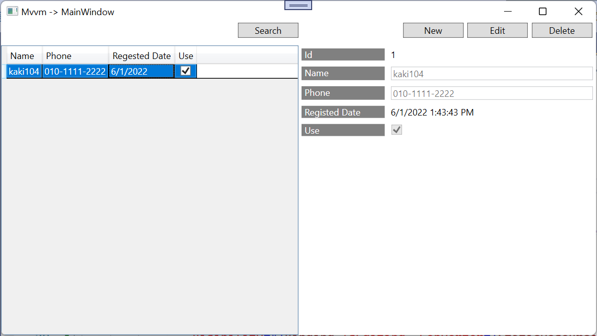 SelectionChanged 이벤트를 이용해서 화면에 출력하도록 구성했지만, DataGrid의 SelectedItem을 직접 ViewModel에서 바인딩해서 사용하는 경우가 더 많습니다.