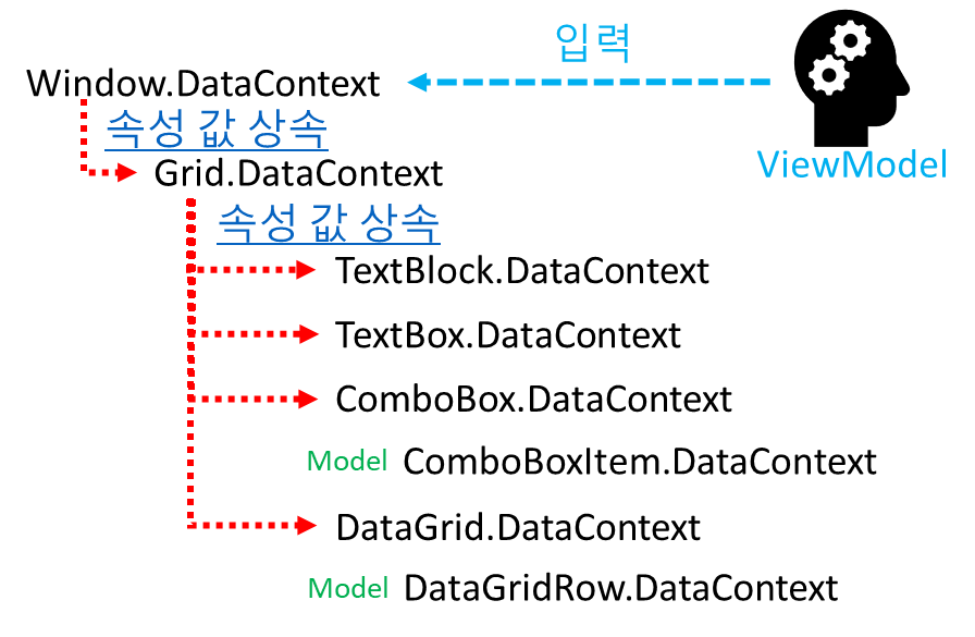 - 우린 Window.DataContext 한곳에만 넣었지만, Window 하위 컨트롤들이 상위 컨트롤의 DataContext 값을 이용할 수 있게됩니다.