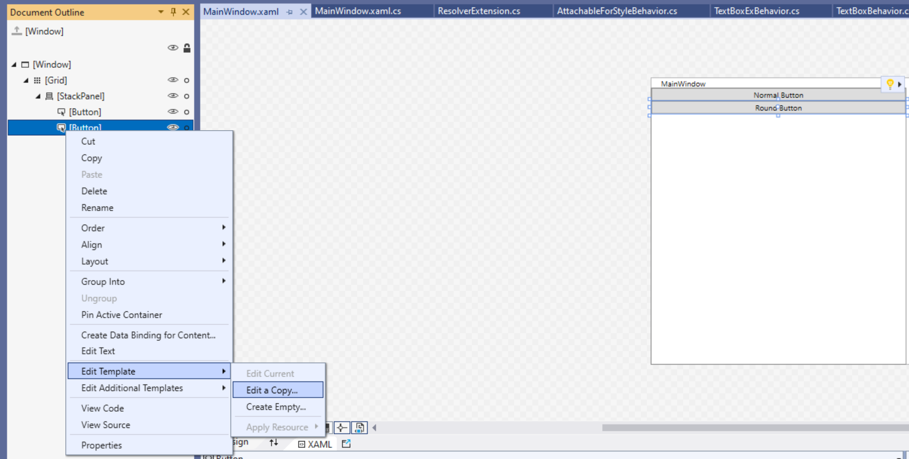 Button 컨트롤을 하나 추가한 후 Document Outline에서 마우스 오른쪽 -> Edit Template -> Edit a Copy...