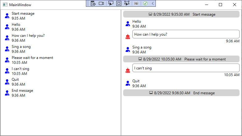 new MessageModel{ Id = 3, MessageType = "Bot", Message = "How can I help you?", CreateAt = DateTime.Now.AddMinutes(1) },