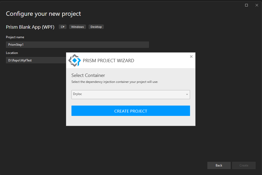 프로젝트명을 입력 -> Create 클릭 -> DryIoc 선택 후 Create Project 클릭