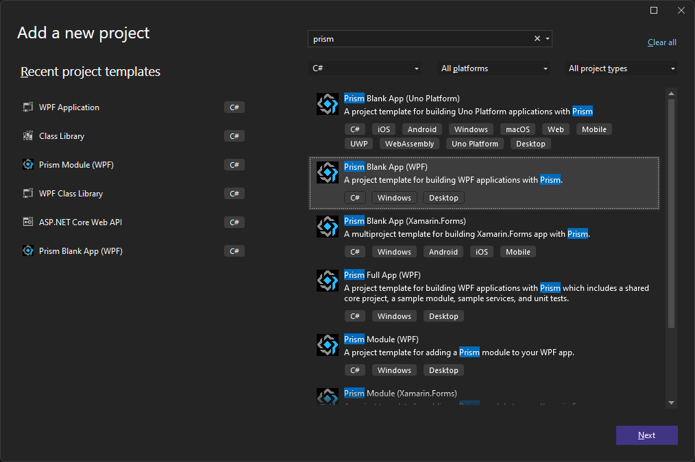 prism으로 템플릿을 검색 -> Prism Blank App (WPF) 선택 -> Next