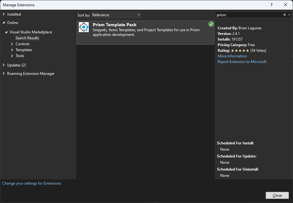 비주얼 스튜디오의 Extensions -> Manage Extensions -> prism으로 검색 -> Prism Template Pack 선택 후 설치
