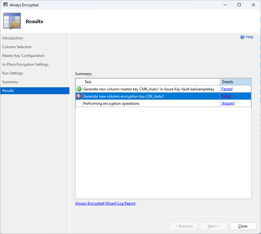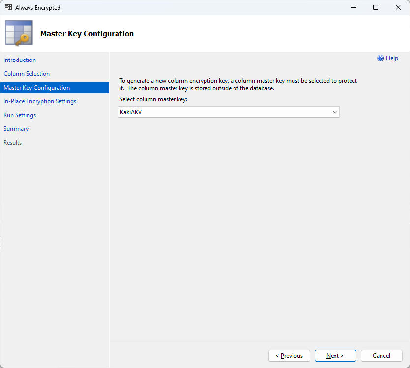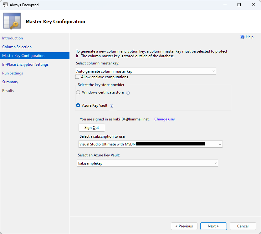 Select the key store provider -> Azure Key Vault 선택 후 Next\