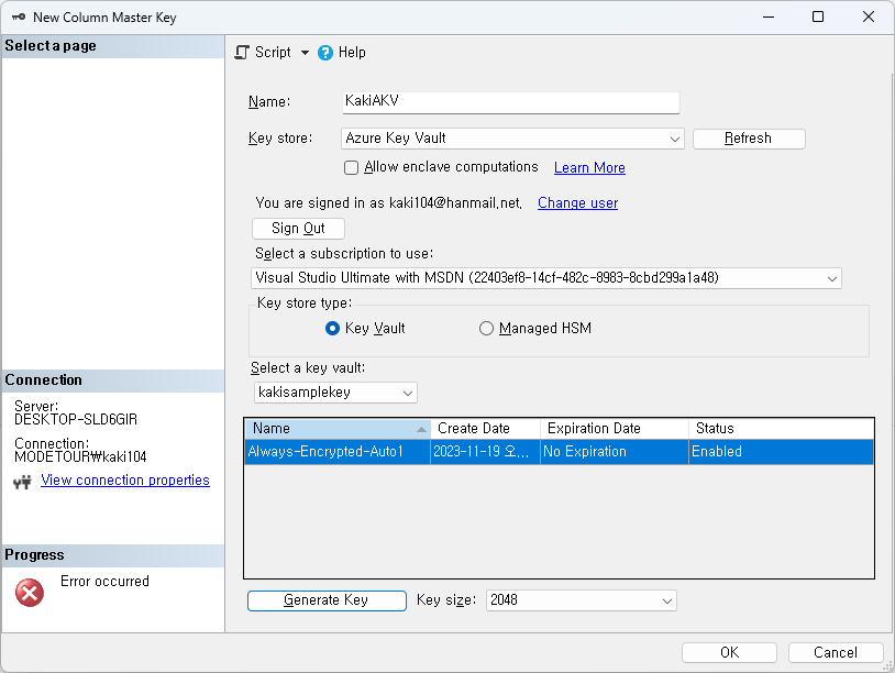 다시 위의 과정을 반복하다가 여기서 Auto generate column master key를 눌러서 KakiAKV를 선택했습니다. 좀전에 마스터 키를 등록했으니 그 녀석을 사용해야 겠죠?