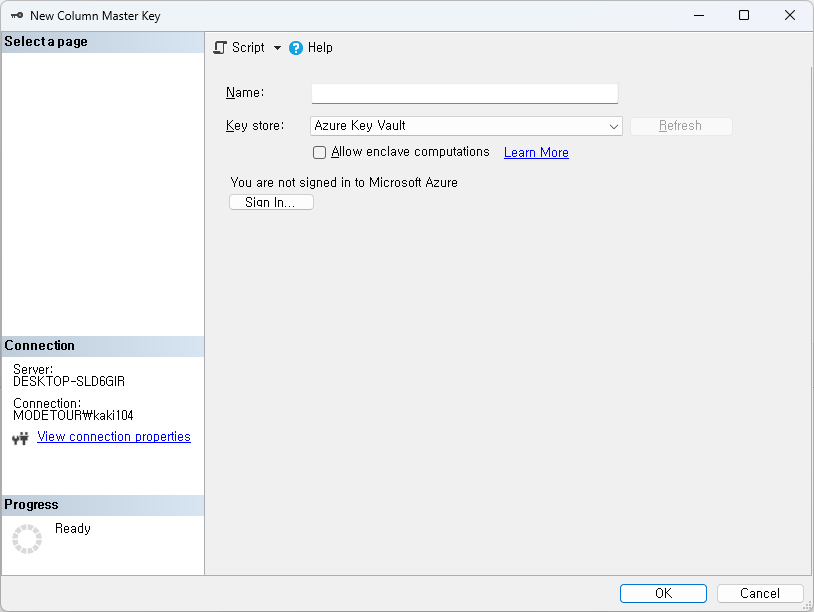 Key store 콤보박스 선택해서 Azure Key Vault 선택, Allow enclave computations는 선택 미선택