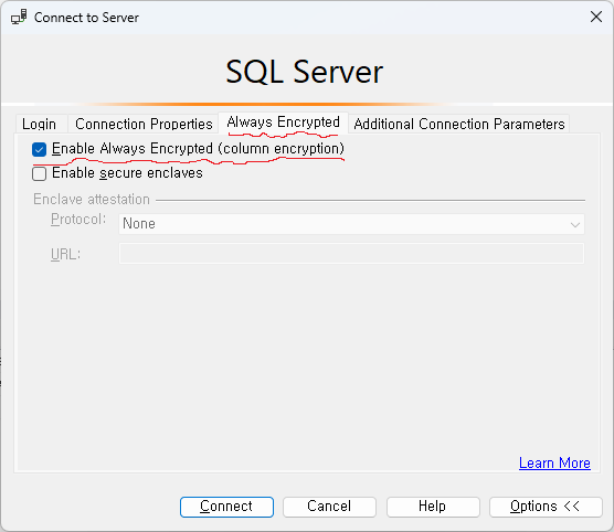 연결할 때 Option -> Always Encrypted 탭에서 Enable Always Encrypted를 선택하고 Connect를 누릅니다.