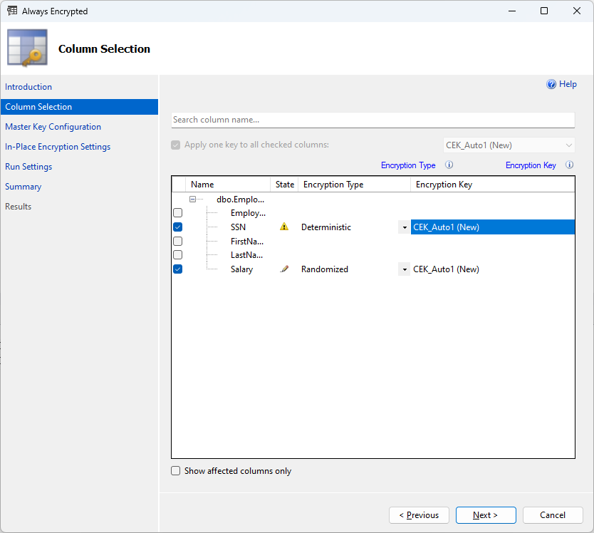 2개의 컬럼을 선택하고 아래와 같이 암호화 방식 선택 후 Next