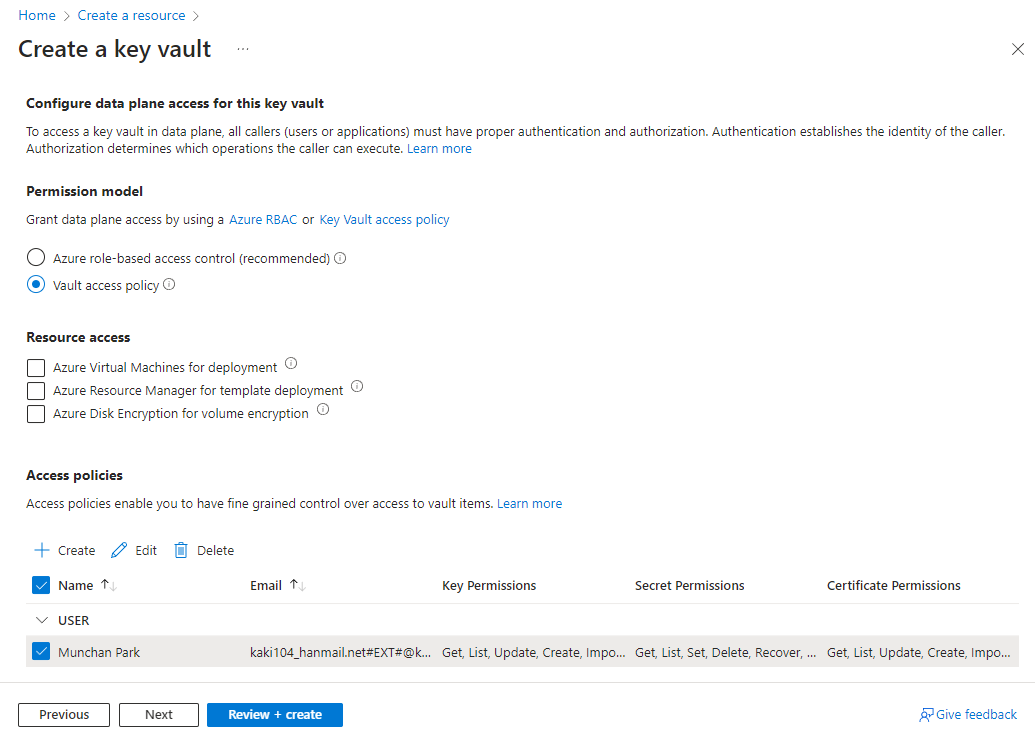 Review + create 버튼을 클릭해서 내용확인 하고 Create 버튼을 눌러서 서비스를 생성합니다.